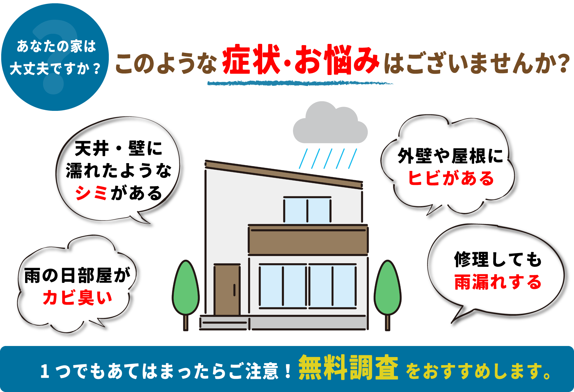 雨漏れの原因は一つだけではなく、様々な原因が考えられます。瓦の破損や外壁部分の隙間、ベランダの防水材の劣化、窓回りのコーキングの劣化など建物に深刻な被害をもたらします。雨水が建物内部に侵入すると、建物の天井や柱、梁、壁の内部を汚染していき、その部分からカビが発生し腐食し、補修には多額の費用がかかります。